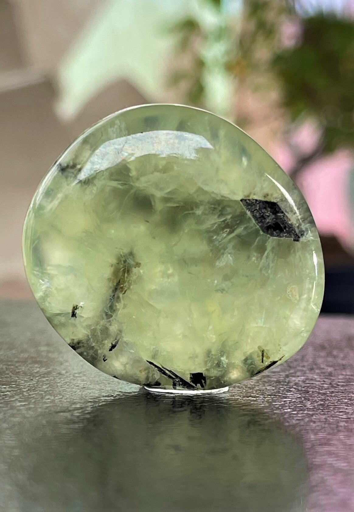 Prehniet met Toermalijn platte knuffelsteen of zaksteen
