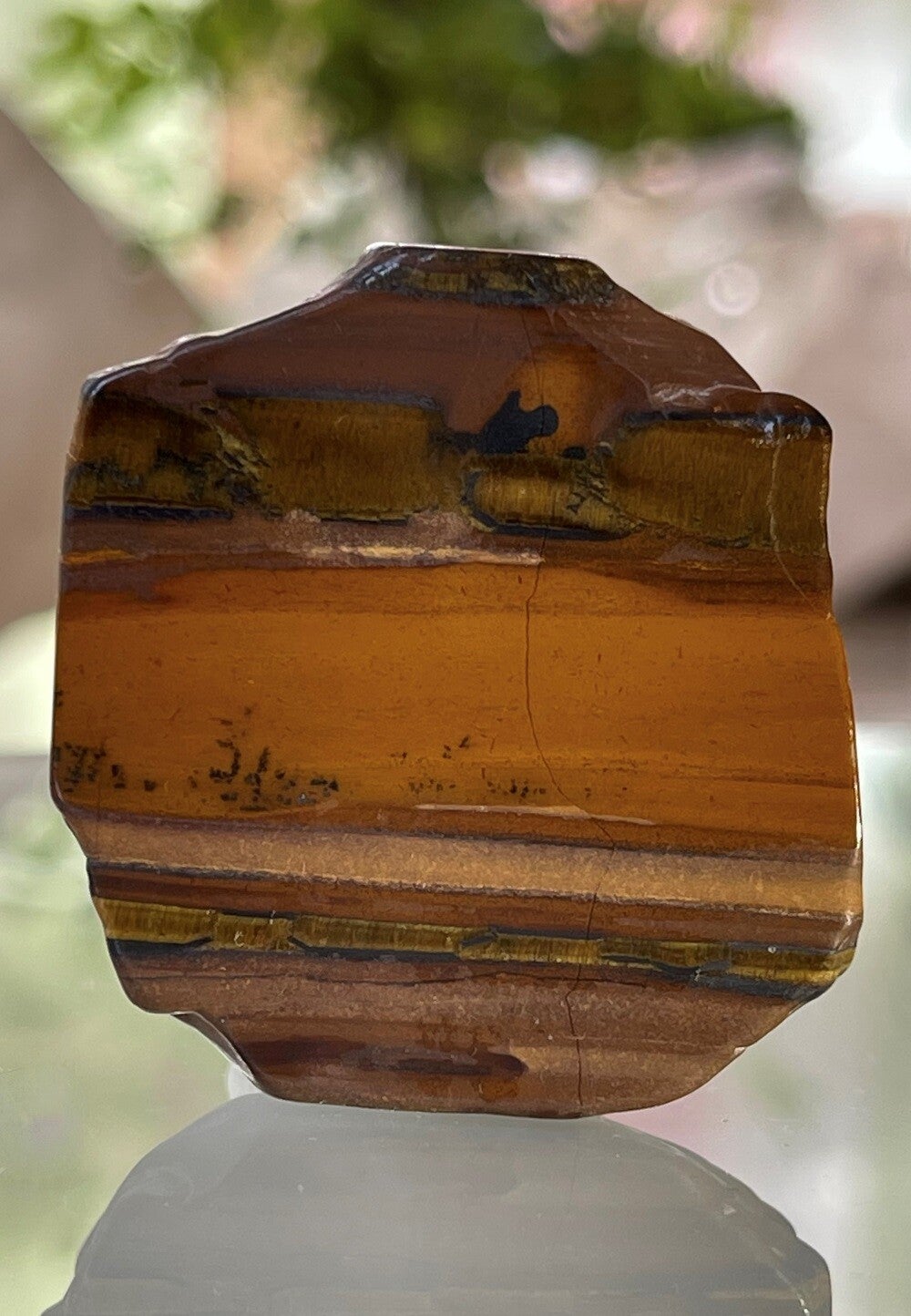Tijgeijzer platte steen aan twee zijden gepolijst, de buitenrand is ruw getrommeld