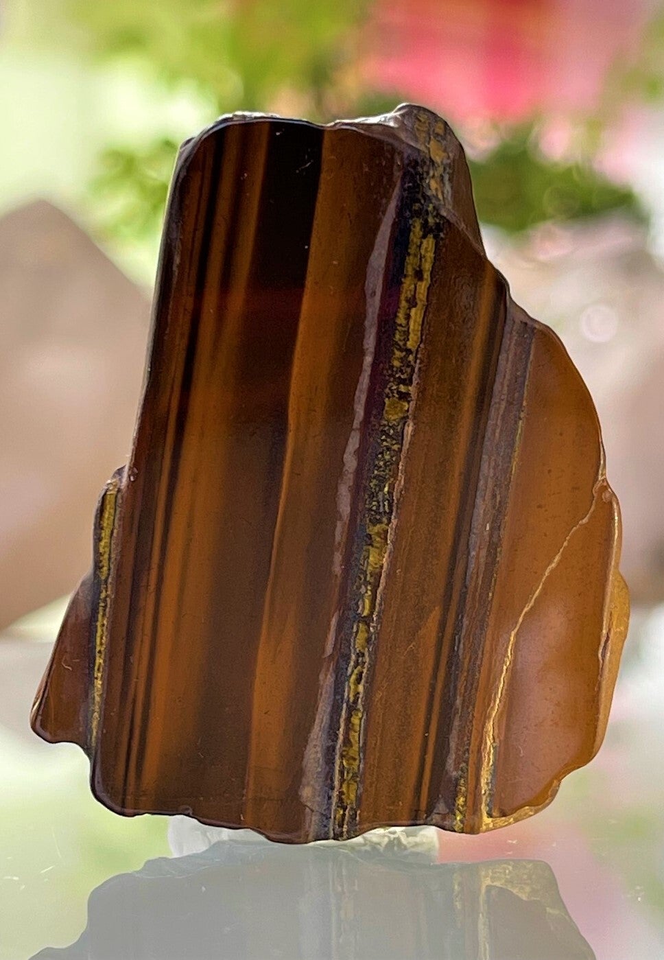 Tijgerijzer platte steen aan twee zijden gepolijst, de buitenrand is ruw getrommeld