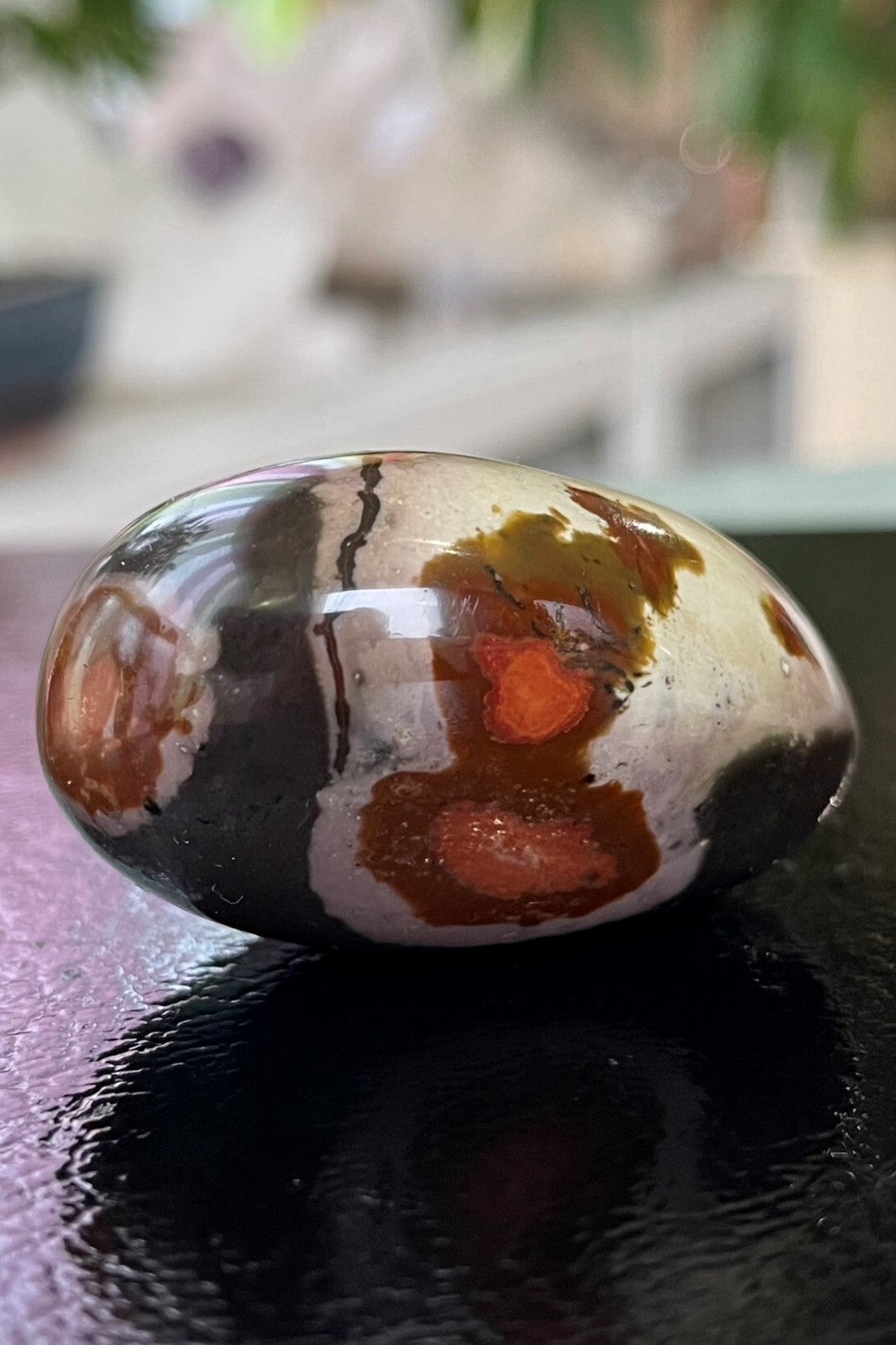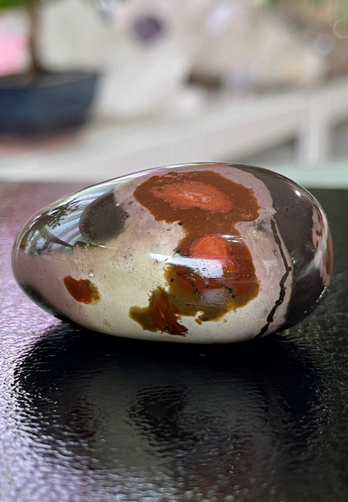 Polychroom Jaspis heeft de algemene eigenschappen van Jaspis en helpt je verder als je door de bomen het bos niet meer ziet. Door de vele problemen ziet men niet meer waar het begin is. Bij chaos in aardse zaken, als men van de hak op de tak springt.