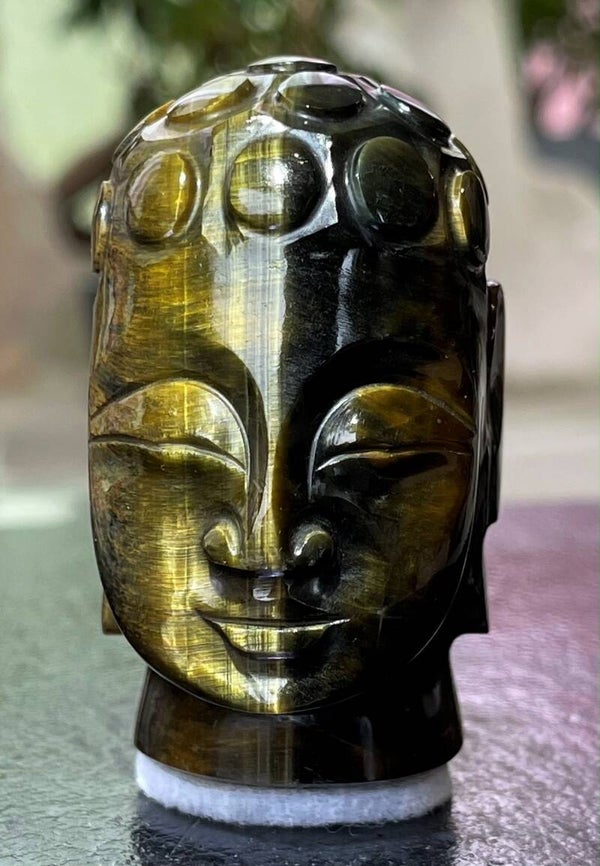 Handgemaakt Boeddha hoofdje van Tijgeroog, statue uit India, klein-medium