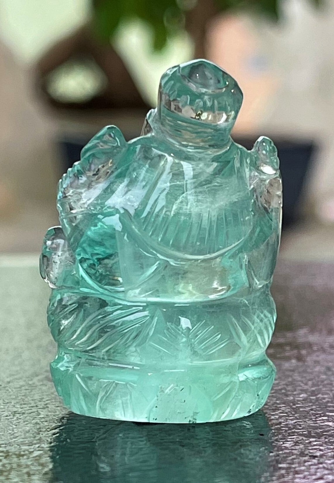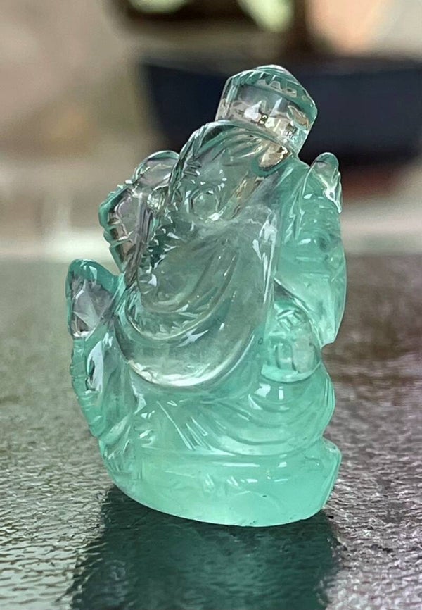 Handgemaakte Ganesha van groene Fluoriet, statue uit India, heel klein