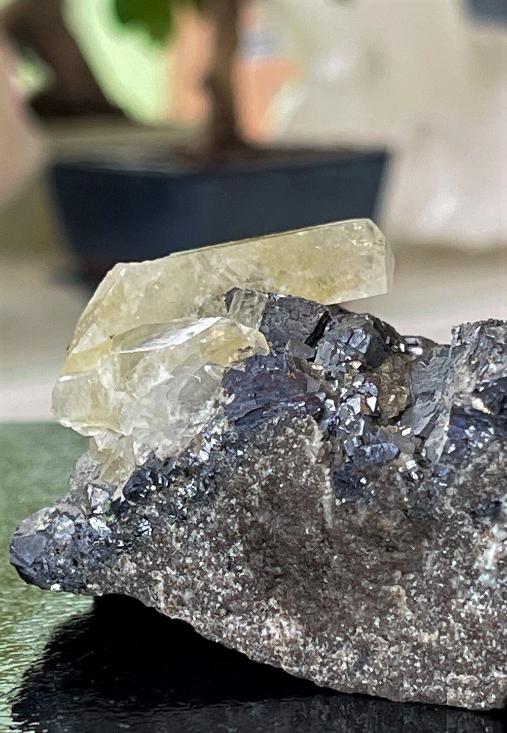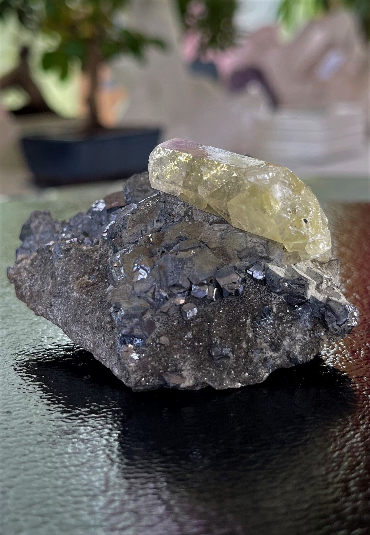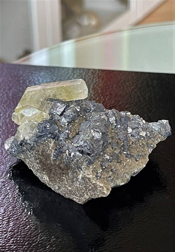 Ruw stukje gele Calciet op Galeniet uit Bad Bleiberg, Karinthië, district Villach, Oostenrijk, medium