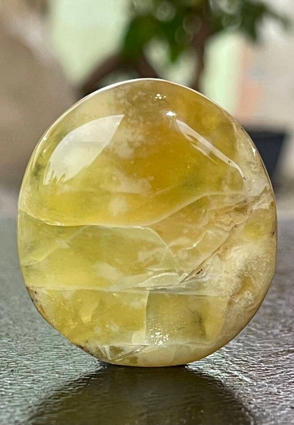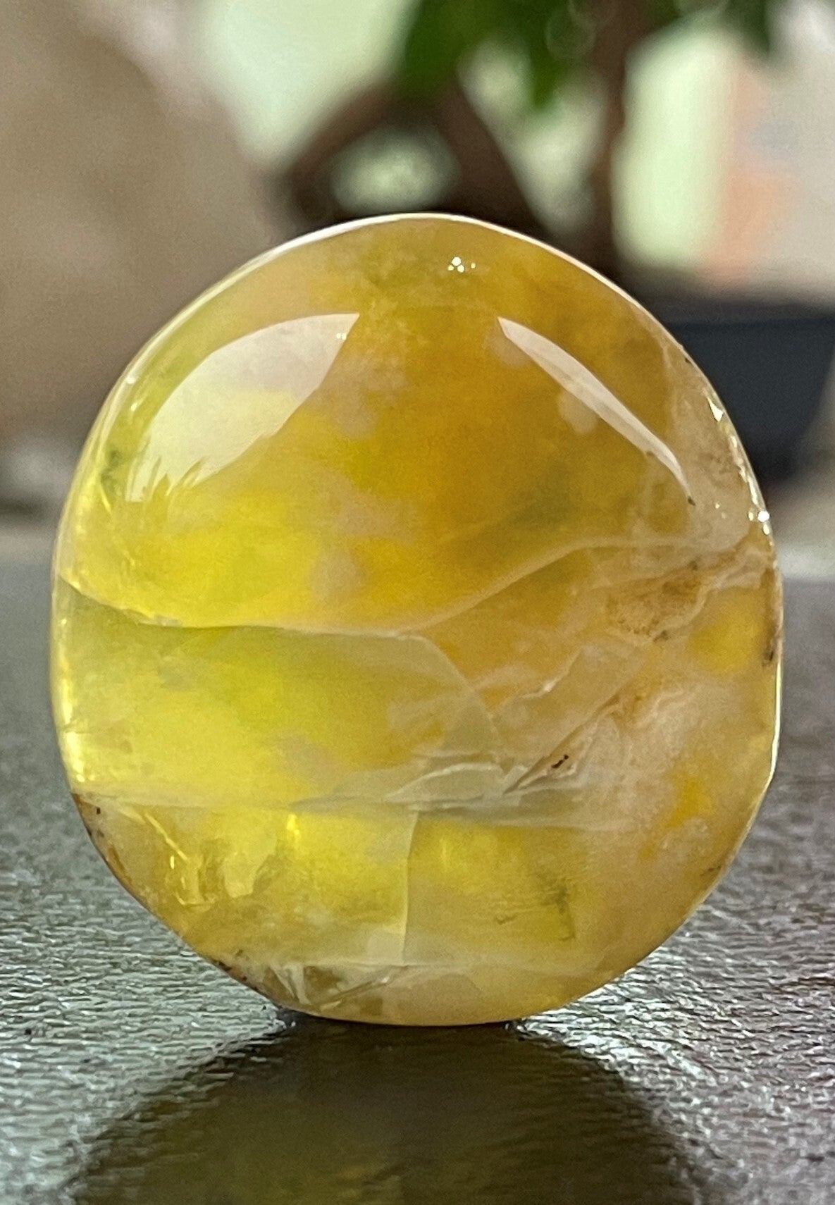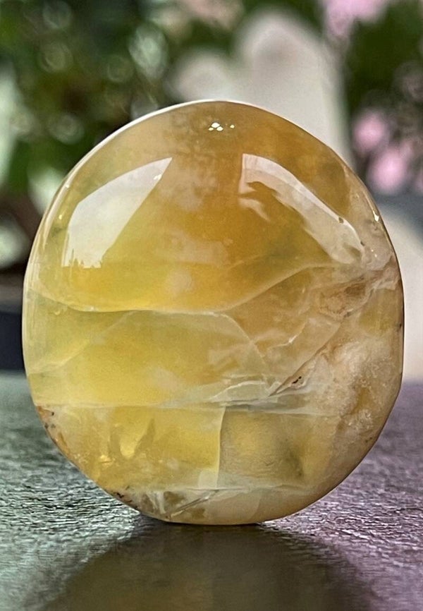 Prachtig stukje gele regenboog Calciet platte knuffelsteen of zaksteen
