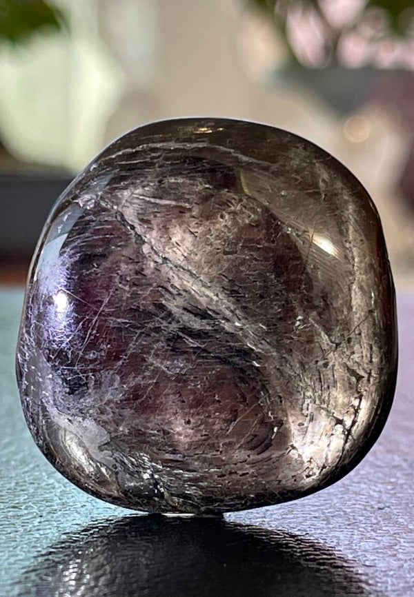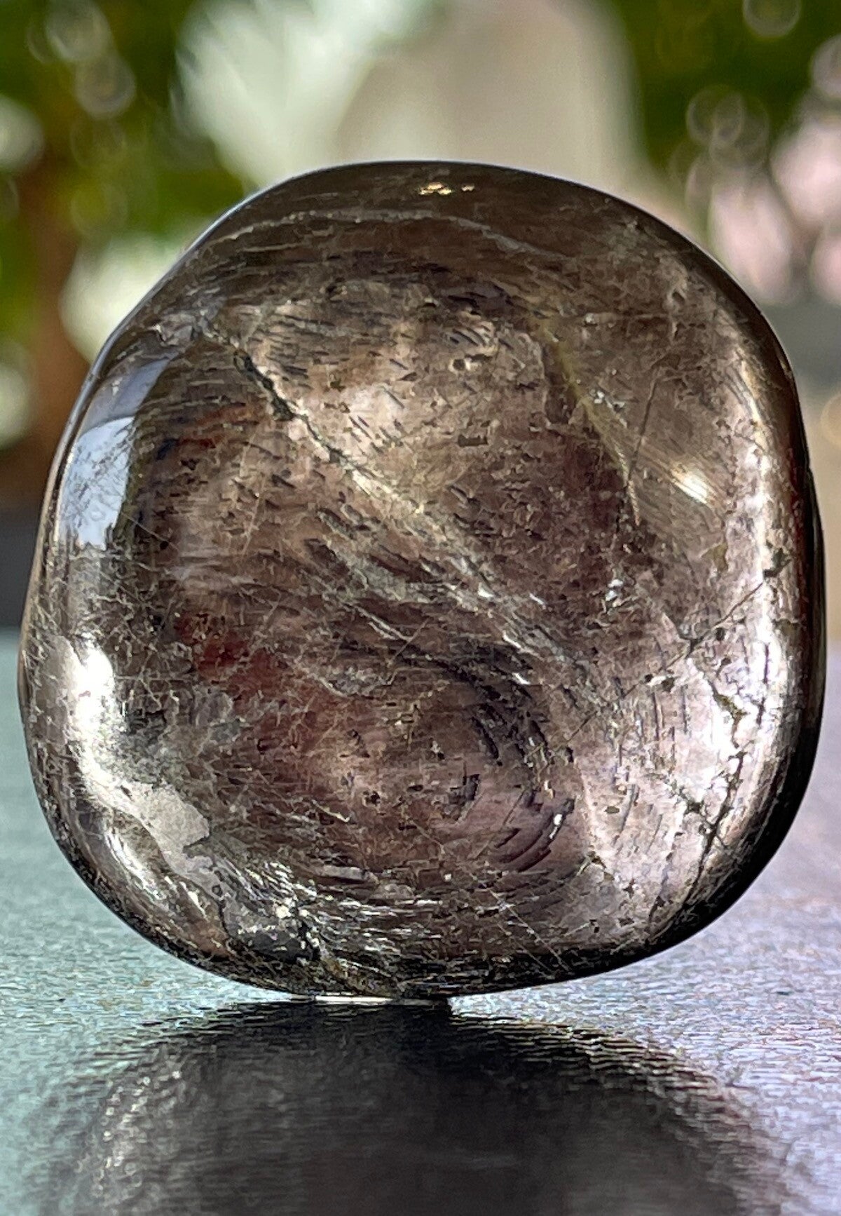 Hypersteen platte knuffelsteen of zaksteen met prachtige glans aan beide zijden